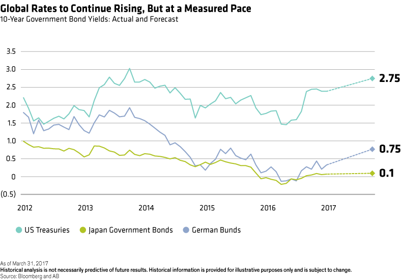 • Not So Fast. While the days of rock-bottom rates may be over, investors aren’t out of the low-yield woods just yet. We expect future global rate rises, led by the US Federal Reserve, to be slow and measured (Display). That means yields (and, indeed, returns across all asset classes) are likely to remain below historical averages for the foreseeable future. Insurers will still need to look beyond their traditional fixed-income solutions to meet long-term obligations.