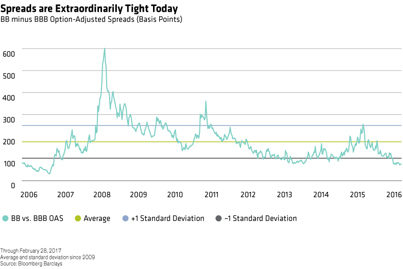 Even so, caution signs are blinking. Valuations look stretched: the spread differential between BBB-rated and BB-rated bonds is as tight as it's been for the past decade (Display).