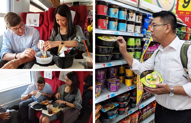 Analyst Vivian Chen and Emerging Markets Chief Investment Officer Henry D’Auria try out an instant, self-heating Chinese hot pot while traveling 300 km/h on a bullet train.