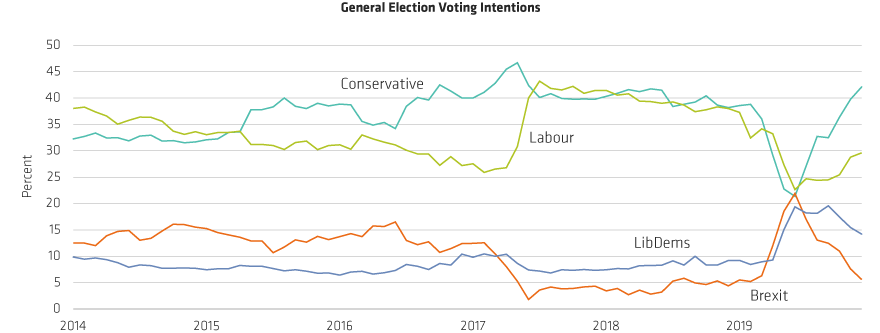 As things stand, Johnson is in pole position. Opinion polls released over the past week put the Conservative Party’s share of the national vote at an average 42%, 12 points ahead of the Labour Party’s 30% (Display). In theory, this should be enough to give the Prime Minister a comfortable majority of more than 50 seats.
