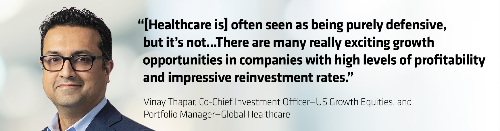 Vinay Thapar, Co-Chief Investment Officer—US Growth Equities, and Portfolio Manager—Global Healthcare: We like to interrogate businesses on fundamental drivers including capital efficiency, reinvestment rate, barriers to entry and durable competitive advantages, including pricing power. In a period of higher inflation, can they pass on pricing without having a deleterious effect on volumes? We’re starting to see that in consumer staples, where some companies are taking aggressive price increases with a corresponding decline in volumes. You want to find businesses, in our view, that are resilient through periods of economic turmoil and that give you the confidence to re-risk your portfolio if the macro environment provides that opportunity.