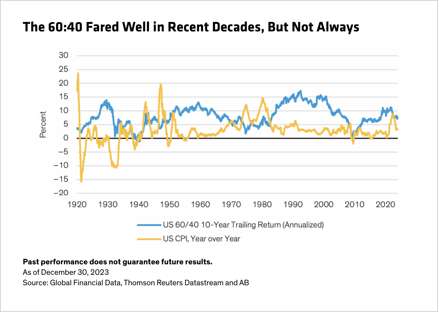 Line graph with time (1920–2023) on the X-axis and US 60/40 returns and US CPI year-over-year compared on the Y-axis.