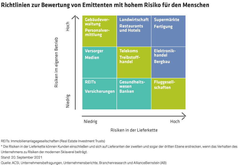 Ein Unternehmen, das gewerbliche Immobilien in einem Land besitzt, könnte beispielsweise durch die von einem Reinigungsunternehmen eingesetzten Wanderarbeiter immer noch dem Risiko der modernen Sklaverei ausgesetzt sein. Auch wenn die REITs-Branche im risikoärmeren Teil der Matrix erscheint, könnte unser unternehmensspezifisches Fundamentalresearch ein REIT-Unternehmen aus ihrer Vergleichsgruppe herausgreifen und sie einem anderen Quadranten zuordnen.