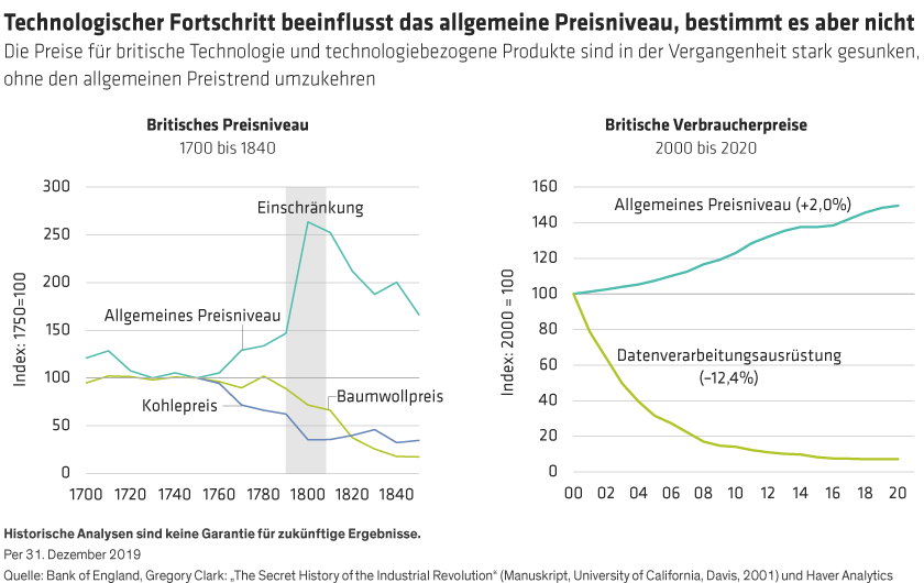 Frühere technologische Revolutionen können einen Anhaltspunkt bieten – und sie haben nicht immer zu einem niedrigeren allgemeinen Preisniveau geführt. Während der ersten industriellen Revolution zum Beispiel stieg das allgemeine Preisniveau in Großbritannien stark an, als die britische Regierung zwischen 1797 und 1821 die Konvertierbarkeit von Papiergeld in Gold aussetzte. Diese Aufwärtsbewegung erfolgte trotz des starken Abwärtsdrucks auf die Preise einiger Rohstoffe (Abbildung oben links). Dieses Muster hat sich in den letzten Jahren sogar wiederholt, wobei die Inflation in Großbritannien trotz eines massiven Rückgangs der Preise für technologiebezogene Produkte nahe an der Zielmarke von 2 % liegt (Abbildung rechts).