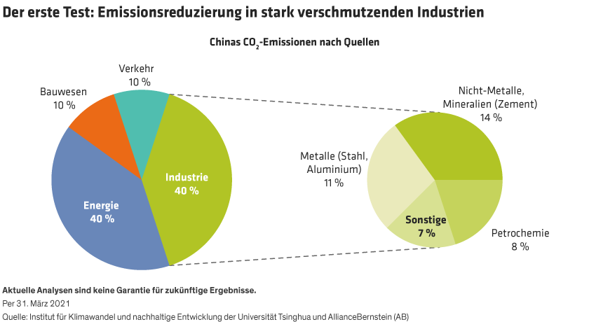 Die Eindämmung von Industrien mit hohem Schadstoffausstoß dient unserer Ansicht nach als erster Test für Chinas Entschlossenheit. Da der Industriesektor für 40 % der CO2-Emissionen Chinas verantwortlich ist (Abbildung), werden Kapazitätskürzungen in der Kohle-, Aluminium- oder Stahlverarbeitung als erste Vorboten dafür dienen, wie Peking seine beiden Haupt-Umweltziele in den kommenden Jahrzehnten erreichen will.