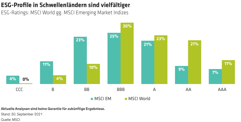Ertragsprognosen müssen die mangelnde Einheitlichkeit der ESG-Merkmale innerhalb der Sektoren berücksichtigen. Rohstoffe umfassen beispielsweise sowohl rückwärtsgerichtete Strategien für fossile Brennstoffe als auch zukunftsgerichtete Strategien für erneuerbare Energien. Rückwärtsgerichtete Strategien werden in Bezug auf ESG wahrscheinlich schlechter bewertet, bieten aber Alpha-Potenzial durch Emittenten, die ihre ESG-Praktiken verbessern. Sie sind auch eher substanzorientiert, während zukunftsorientierte Emittenten eher wachstumsorientiert sind.