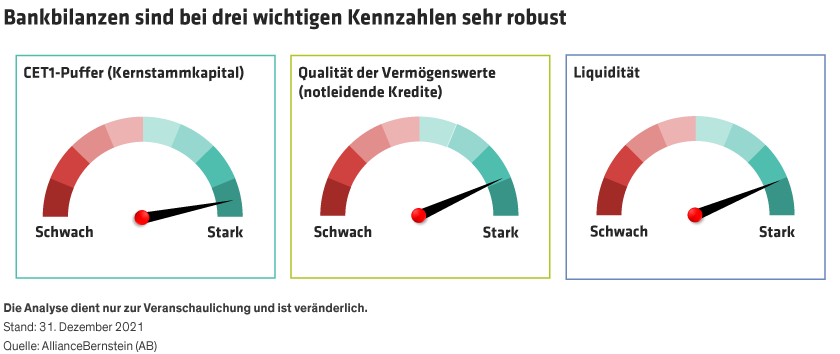Common Equity Tier 1“-Kapitalpuffer sind nahe an einem Allzeithoch. Die Qualität der Vermögenswerte (gemessen am Prozentsatz der notleidenden Kredite) ist sehr robust. Und die Liquidität in den Bilanzen ist außerordentlich hoch, was auf eine Kombination aus noch nie dagewesenem Zugang zu Zentralbankmitteln (insbesondere in Europa), enormen Zuflüssen von Kundeneinlagen und gedämpftem Kreditwachstum zurückzuführen ist.
