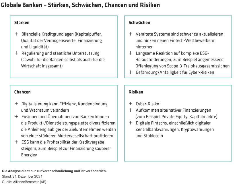 Vier Felder zeigen Stärken, Schwächen, Chancen und Risiken globaler Banken in kurzen Stichpunkten.