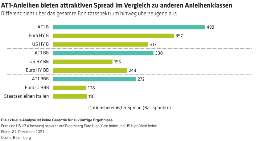 Die aktuellen Bewertungen der vorrangigen und nicht-vorrangigen Schuldtitel der Banken spiegeln bereits einen Großteil der guten Nachrichten wider. Darüber hinaus erwarten wir im weiteren Verlauf des Jahres einen Anstieg der Emission von europäischen vorrangigen Vorzugsanleihen aufgrund der bevorstehenden Änderungen der Bedingungen für das Kreditsubventionsprogramm der Europäischen Zentralbank (TLTRO). Das Nettoangebot an nachrangigen Finanzanleihen dürfte jedoch bei oder nahe null liegen, und die Preise für diese Anleihen sind unserer Ansicht nach weiterhin attraktiv. Insbesondere AT1-Anleihen sehen gegenüber vergleichbaren hochverzinslichen Krediten attraktiv aus (Abbildung). Wir sind der Meinung, dass AT1-Anleihen, die von den stärkeren europäischen Banken begeben werden, den besten Kompromiss zwischen Ertragsmaximierung und Risikominimierung bieten.