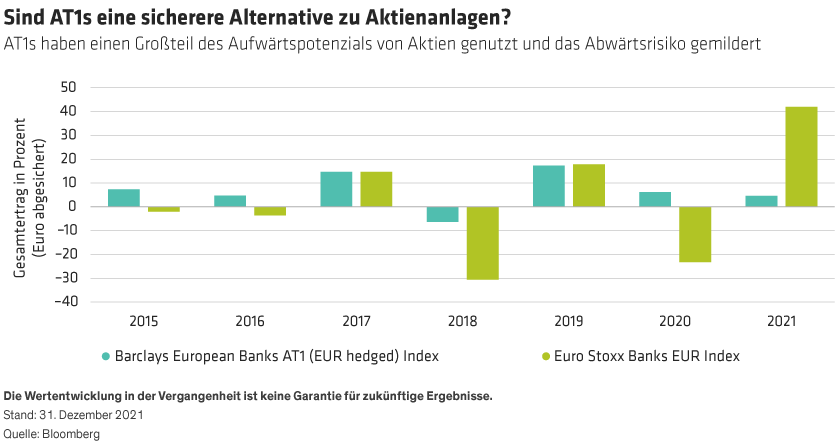 Bar chart comparing returns of Barclays European Banks AT1 and Euro Stoxx Banks EUR Index from 2015 to 2021.