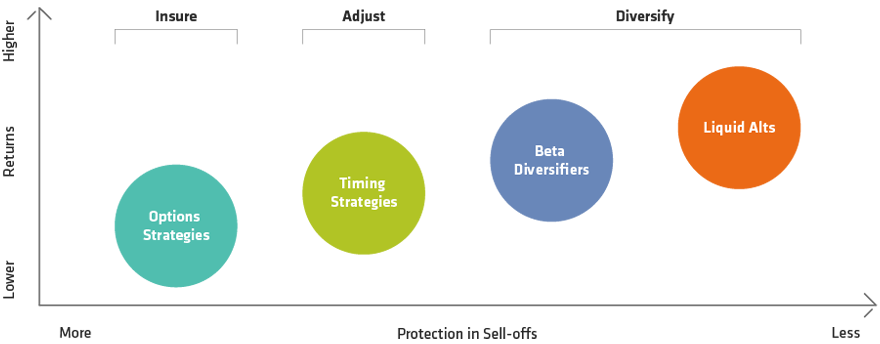 With this broad tool kit, investors are empowered to manage risk flexibly. They can diversify risk using investments such as bonds or liquid alternatives. They can use timing strategies, such as volatility, to allocate away from downside risk. Or they can insure against risk events using options.