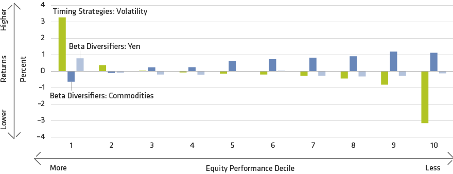Below, we highlight a few of these tools and show how their returns have fared in different levels of equity performance (Display). If we group equity returns by deciles from worst to best, an effective risk-management tool should perform well when equity markets struggle.