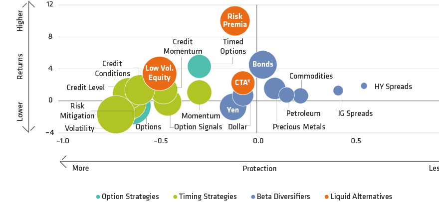 Investors’ time horizons also influence the categories and types of risk-management tools they select. Beta diversifiers and liquid alternatives, for instance, are more effective as long-term diversifiers than in protecting against short-term shocks. That role is better played by tactical asset allocation strategies, which tilt away from equity risk, and options, which automatically cut equity beta.