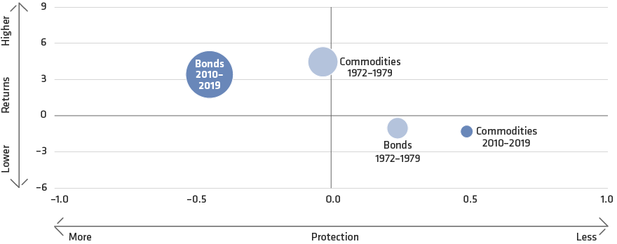 Bonds and commodities—two members of the beta diversifiers category—are another example of how risk-management effectiveness varies across periods (Display). In the 1970s, bonds were positively correlated to equities and posted poor risk-adjusted returns. But since 2010, duration has been much more effective, with a negative correlation to stocks and solid risk-adjusted returns. Commodities have been a mirror image: very effective in the high-inflation 1970s, but much less so when disinflation reigned, as it did from 2000 through 2010.