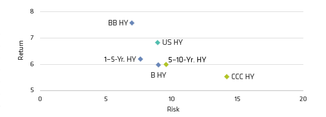 2% Issuer Capped index; 5–10-year HY is represented by Barclays US High Yield 2% Issuer Capped 5–10 Year; BB HY is represented by Barclays US High Yield 2% Issuer Capped Ba Component; B HY is represented by Barclays US High Yield 2% Issuer Capped B Component; and CCC HY is represented by Barclays US High Yield 2% Issuer Capped CCC Component.