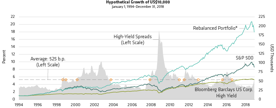 Past performance is not a guarantee of future results. There can be no assurance that an actual portfolio based on the hypothetical portfolio underlying the above illustration could be created or, if created, that it would achieve the results implied above or be profitable. Based upon a hypothetical portfolio; accordingly, such performance is not based upon historical performance of any investment portfolio. *For the purposes of this hypothetical scenario, 525 b.p. is the approximate long-term average. This illustration is not intended to provide either a complete analysis regarding any or all of the variables that could affect any particular portfolio. High-yield spreads are represented by option-adjusted spreads for Bloomberg Barclays US Corporate High Yield. The Rebalanced Portfolio tactically alternates between US High Yield and S&P based on a 525 b.p. spread decision rule. Performance is based on spread levels and returns. The returns do not account for transaction fees, expenses or taxes. The Rebalanced Portfolio assumes an investor began the period (January 1, 1994) invested in the S&P 500 and made the following (nine) transactions: sold the S&P and bought high yield on November 1, 1998; sold high yield and bought the S&P on March 1, 1999; sold the S&P and bought high yield on May 1, 2000; sold high yield and bought the S&P on October 1, 2003; sold the S&P and bought high yield on January 1, 2008; sold high yield and bought the S&P on March 1, 2011; sold the S&P and bought high yield on August 1, 2011; sold high yield and bought the S&P on February 1, 2013; sold the S&P and bought high yield on October 1, 2015. This illustration is not intended to provide a complete analysis regarding any or all of the variables that could affect any particular portfolio.