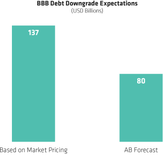 At the time, we said that a group of US investment-grade bonds worth a much smaller amount were at risk of becoming fallen angels, as formerly high-grade bonds are known. Our research suggests about $80 billion worth could tumble to high yield (Display 1), and we think the process could take years to play out.