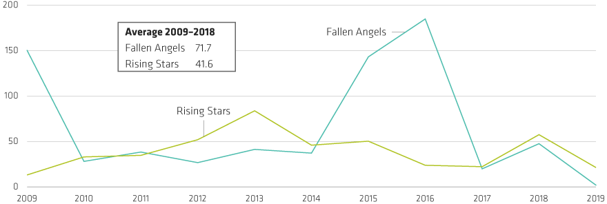 Fallen-angel volume was high after the global financial crisis and following a plunge in oil prices in 2014 and 2015, though this did not overwhelm the high-yield market. Recently, there have been more rising stars—bonds that were upgraded from high-yield to investment-grade status—than fallen angels, a trend that has continued so far in 2019.