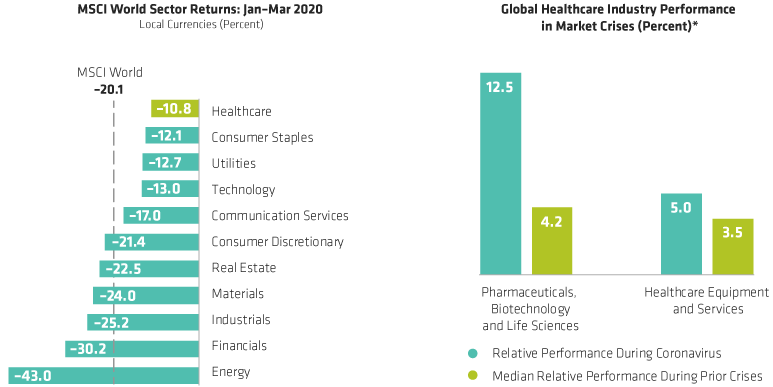 Healthcare stocks outperformed all sectors in the first quarter. In the MSCI World Index, the healthcare sector fell by 10.8%, while the benchmark dropped by 20.1% in local-currency terms (Display, left). With the worst-performing sectors such as financials and energy falling by 30.2% and 43.0%, respectively, healthcare stood out as a relatively solid sector for uncertain times. Our analysis shows that healthcare industries posted better relative performance versus the MSCI World during the recent downturn than in previous market crises (Display, right).