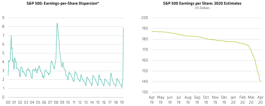 Today, the pretense of precision is gone. While earnings consistency usually breaks down in recessions, the exogenous shock of the coronavirus—and the scale of the fallout—has shattered any attempt to predict the near future. Since the extent of current guidance withdrawals is so broad, we anticipate an even greater dispersion of earnings expectations than we have already witnessed (Display below, left).