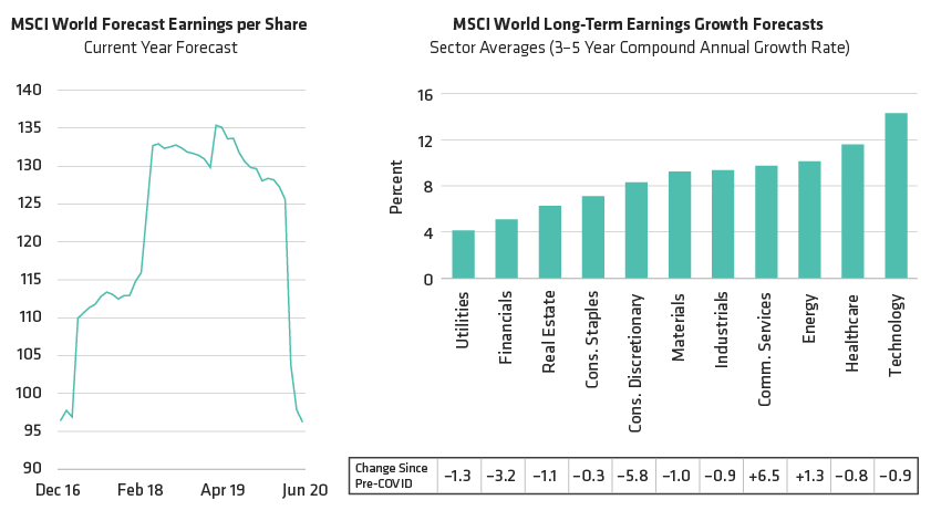 Nobody can deny the challenges facing companies this year. As countries locked down economies to contain the spread of COVID-19, the 2020 earnings per share forecast for MSCI World companies plunged by 24% to about US$0.96 at the end of June (Display below, left).