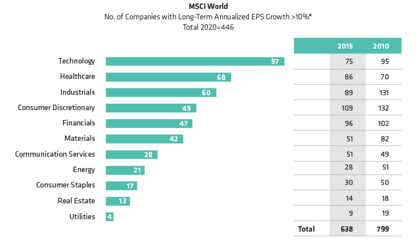 The number of MSCI World companies by sector projected to grow earnings by at least 10% per annum in the next three- to five-years.