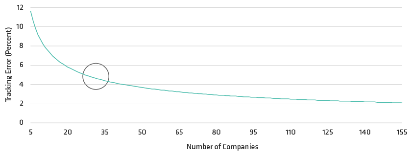 An analysis of tracking error for portfolios of MSCI World stocks, based on the number of stocks held in a portfolio.