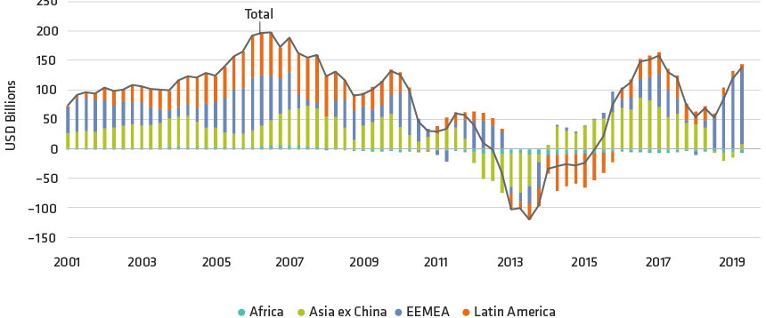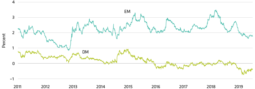 In particular, EM economies are less vulnerable to external shocks than in the days of the taper tantrum, thanks largely to improving current account balances and stable foreign direct investment (FDI). Display 1 combines EM current account balances with FDI flows—typically a stickier, multiyear commitment—into EM countries. This “basic balance” measure provides a fuller (and today, a healthier) picture of EM countries’ external vulnerability. Notably, this is an aggregate measure, and pockets of weakness certainly remain—another reason why it will be important to be selective in 2020.