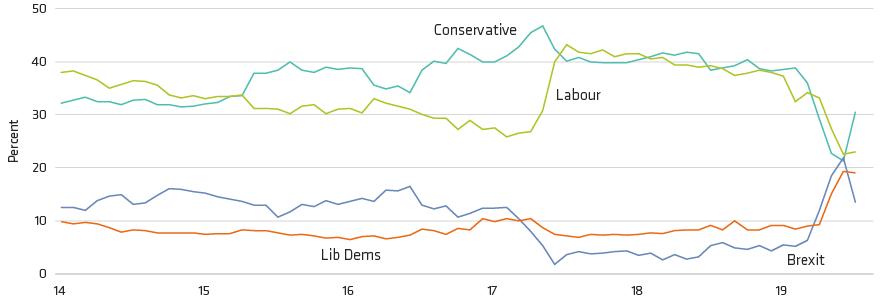 The second leg of Johnson’s strategy is therefore to prepare for an election at which the Conservative Party would campaign on a hard Brexit platform. In fact, an early election looks increasingly likely, either because the Conservative Party’s vote share starts to improve and Johnson thinks it would strengthen his position in Parliament, or because Parliament topples the government in order to avoid a no-deal Brexit.