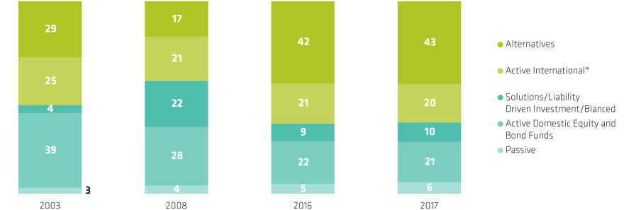 Source: Victoria Ivashina and Josh Lerner, “Looking for Alternatives: Pension Investments around the World, 2008 to 2017,” GrowthPolicy.org (website), August 2018 and Sanford C. Bernstein