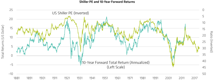 The basis for a lower return outlook is essentially the decline in yields across asset classes over the last 30 years. Specifically, the Shiller price/earnings ratio (price divided by 10-year inflation-adjusted earnings) is currently in its top decile since 1880 (Display 1). This matters because the Shiller PE is one of the best long-term equity-return forecasting tools at our disposal.