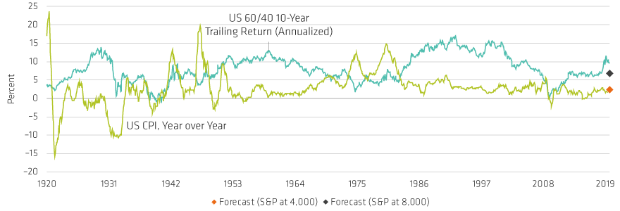 The black and orange diamonds represent two possible scenarios for 60/40 returns based on the outlook for equities. In the first scenario, the S&P 500 is projected to reach 4,000 in the next 10 years. In the second scenario, it is projected to reach 8,000. In both cases the forward returns to bonds is assumed to be equal to the current