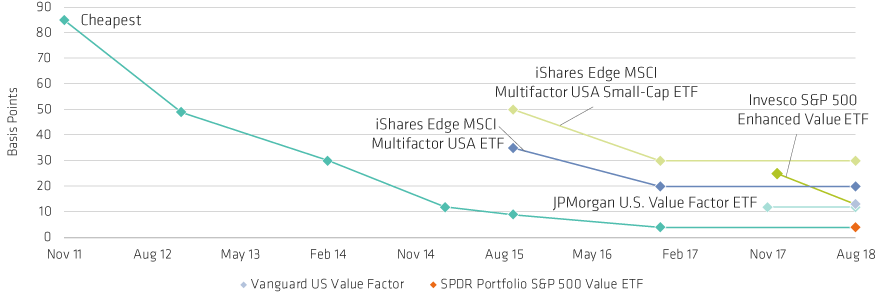 This time series of smart-beta fees has been created from pricing of some of the most popular smart-beta products for large-cap US equities.