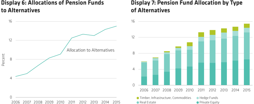 Line and bar graphs showing pension fund allocations to alternatives from 2006 to 2015, broken down by type.