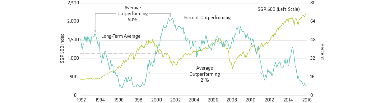 Represents the percent of mutual funds in the US Large Blend Morningstar category outperforming the S&P 500 on a rolling threeyear basis with a monthly step The data include active mutual funds only.