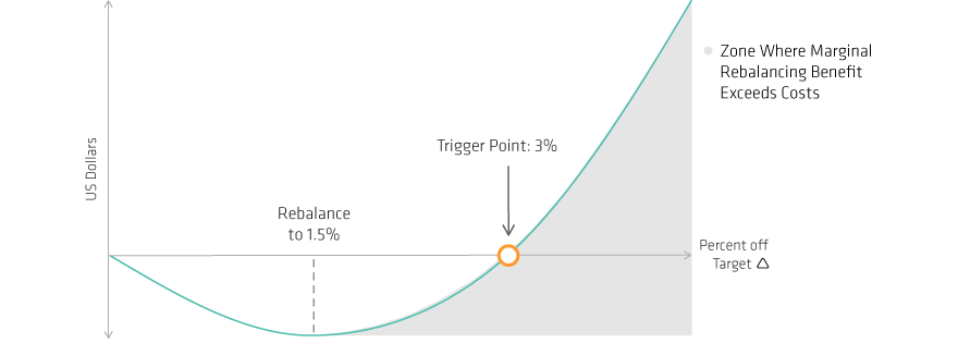 Red arrow represents rebalance triggered on December 12, 2019; green arrows represent rebalance is trade on March 9, March 12 and March 23, 2020. The 60\40 portfolio components are represented by 60% and MSCI All Country World Index and 40% Bloomberg Barclays US Aggregate Bond Index.