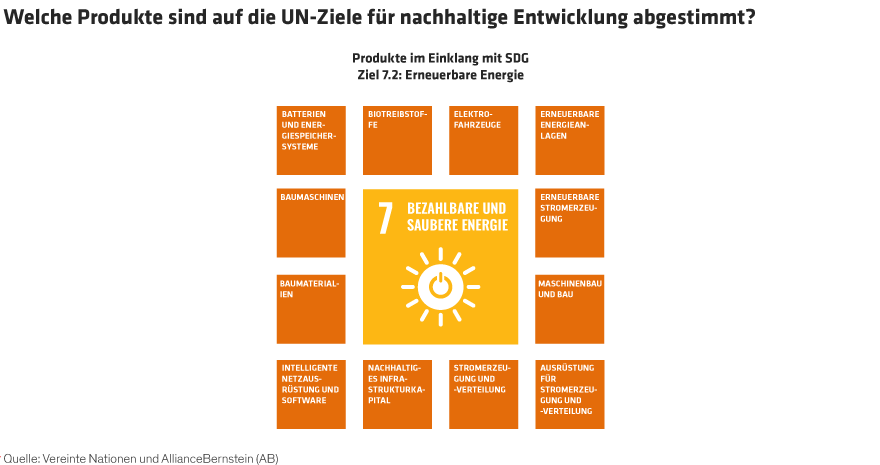 Unsere Untersuchungen haben ergeben, dass sich 57 der 169 SDG-Unterziele speziell auf Klimalösungen beziehen. In einer eigenen, mehrjährigen Studie zu den SDGs der Vereinten Nationen haben wir mehr als 45 Produkte und Dienstleistungen identifiziert, die mit diesen Zielen in Einklang stehen. Zum Beispiel lautet das Ziel 7.2, „den Anteil erneuerbarer Energie am globalen Energiemix bis 2030 deutlich zu erhöhen“, und Produkte, die das Erreichen dieses Ziels ermöglichen, darunter Windturbinen, Solarpaneele, Batterien für die Energiespeicherung und Intelligente Netzsysteme (Abbildung). Der nächste Schritt für Aktienanleger ist die Suche nach börsennotierten Unternehmen, die mit diesen Produkten Einnahmen erzielen. Unsere Recherchen deuten darauf hin, dass etwa 750 Unternehmen weltweit die Welt in Richtung einer grüneren Zukunft bewegen, was ein breites Anlageuniversum aus vielen Sektoren und Branchen schafft.