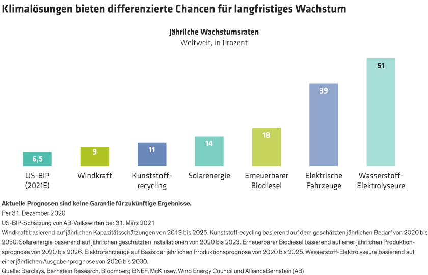 Bar chart shows compound annual growth rates for several climate-related products such as solar power and electric vehicles.