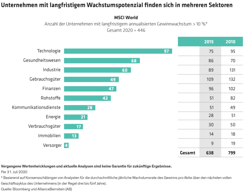 Die Branchendurchschnitte verdecken die leistungsstärksten Sektoren. Tatsächlich wurde Ende Juni von 446 Unternehmen im MSCI World ein langfristiges Wachstum von mindestens 10 % pro Jahr erwartet, darunter 165 Unternehmen in den relativ widerstandsfähigen Technologie- und Gesundheitssektoren (Abbildung, links). Natürlich gibt es weniger solcher Unternehmen als vor fünf und zehn Jahren (Abbildung, rechts). Aber Anleger mit einem stringenten Aktienauswahlprozess sollten in der Lage sein, die besten Kandidaten zu identifizieren.
