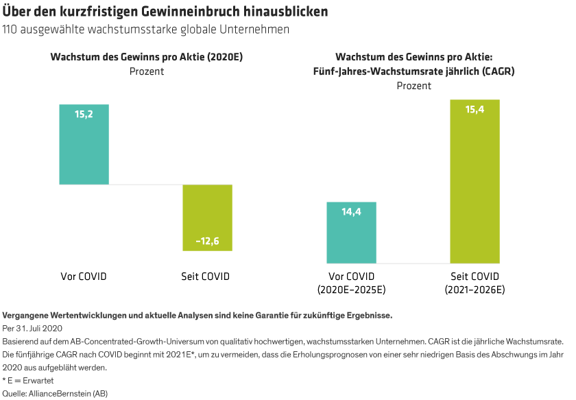 Schon vor der Pandemie hat nur eine kleine Zahl von Unternehmen ihre Wachstumserwartungen tatsächlich erfüllt. Wir haben deshalb 110 der qualitativ hochwertigsten Unternehmen noch strenger ausgewählt, was ein noch größeres Nachholpotenzial aufdeckte. Diese Unternehmen verfügen über bewährte Geschäftsmodelle, Wettbewerbsvorteile, solide Bilanzen und ein erstklassiges Management. Während einige von ihnen mit einem kurzfristigen Gewinndefizit konfrontiert sind, legen unsere Untersuchungen nahe, dass sich für diese Gruppe die langfristigen Gewinnwachstumsraten auf 15,4 % pro Jahr verbessern könnten, sobald das Schlimmste der Rezession hinter uns liegt (Abbildung).