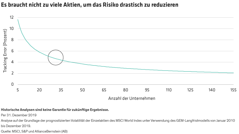 Ist also ein Fünf-Aktien-Portfolio der richtige Ansatz? Wohl kaum. Zwar haben sich Microsoft, Amazon, Facebook, Alphabet und Apple in diesem Jahr extrem gut entwickelt. Aber auf lange Sicht sind nach wissenschaftlichen Untersuchungen zwischen 20 und 35 Aktien optimal. In einem globalen Aktienportfolio werden die meisten Diversifikationsvorteile mit 20 Aktien erzielt (Abbildung). Sobald das Portfolio mehr als 35 Aktien enthält, fallen weitere Diversifikationsvorteile bescheiden aus.