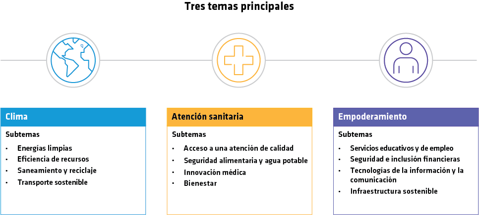 En las carteras sostenibles de AB, las empresas que cumplen los requisitos para ser incluidas deben obtener una elevada proporción de sus ingresos de productos o servicios alineados con los ODS que promuevan tres temas principales: clima, salud y empoderamiento. Cada cartera integra análisis ESG con una selección de valores disciplinada para identificar aquellas empresas que cumplan claros criterios de sostenibilidad y con negocios de calidad que protejan el potencial de rentabilidad a largo plazo.