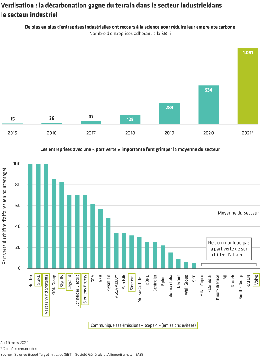 Pour tout un tas de bonnes raisons, davantage d’entreprises sont en train de mesurer et d’améliorer ces indicateurs révélateurs, y compris des entreprises industrielles : dans ce secteur, le nombre d’entreprises qui se sont fixées des objectifs d’émissions fondés sur la science a franchi le seuil des 500 en 2020 et devrait plus que doubler en 2021, alors qu’elles n’étaient qu’une quinzaine il y a encore cinq ans (cf. figure en haut). La part verte du chiffre d’affaires — qui mesure l’exposition d’une entreprise aux produits et aux services respectueux de l’environnement — des entreprises industrielles tourne désormais autour de 50 % (cf. figure en bas).