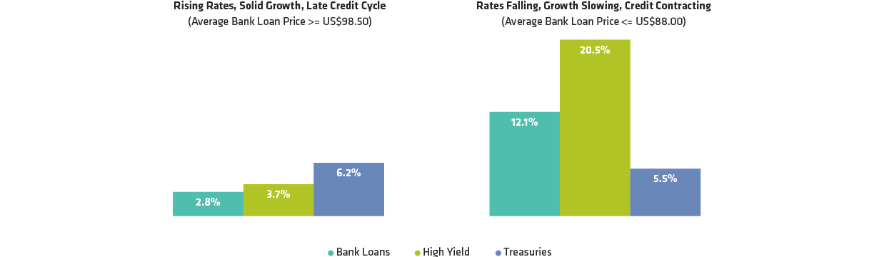 In fact, history suggests that the best time to buy bank loans isn’t when rates are rising but after growth has slowed, the Fed has reduced interest rates and companies have started to clean up their balance sheets and repair their credit metrics.