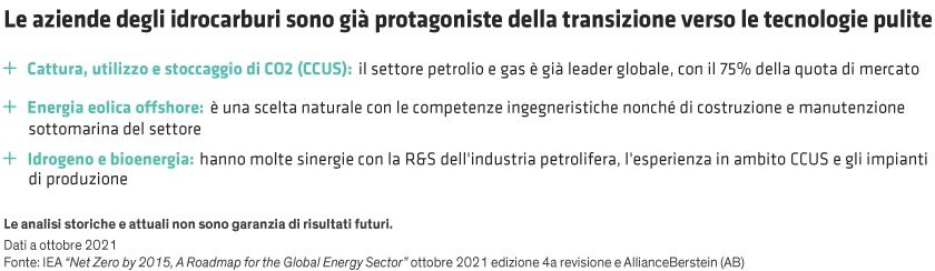 Attualmente, alcune grandi compagnie di petrolio e gas stanno investendo i cash flow generati dagli idrocarburi nello sviluppo di soluzioni basate sulle rinnovabili, comprese le relative infrastrutture come i punti di ricarica dei veicoli elettrici nelle stazioni di servizio. Un altro importante stadio intermedio lungo il percorso è il passaggio dagli idrocarburi più inquinanti, come il carbone, a quelli più puliti, come il gas naturale.