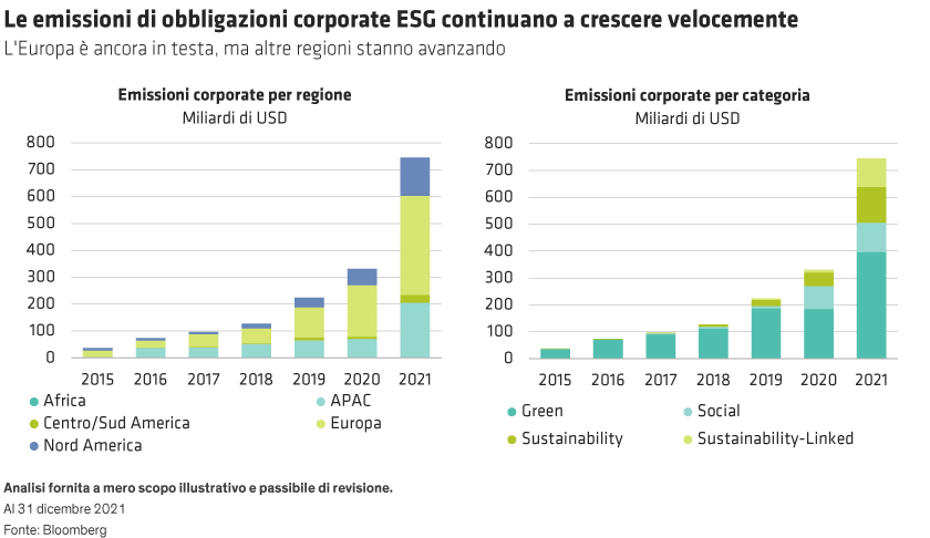 Obiettivi tanto ambiziosi richiedono nuovi capitali e sono dunque particolarmente adatti ad essere finanziati con debito ESG; ne consegue che il mercato delle obbligazioni con etichetta ESG dovrebbe continuare a crescere rapidamente.