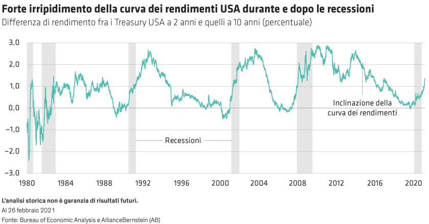 Ovviamente, è importante monitorare anche la natura del rialzo dei rendimenti: salgono a fronte delle maggiori aspettative di crescita? Oppure registrano un aumento perché il mercato prevede che la Fed interverrà con un rialzo dei tassi d’interesse a breve termine? Le implicazioni delle risposte sottolineano la ragione per cui gli investitori devono restare concentrati anche sulla forma della curva dei rendimenti, non soltanto sul livello dei tassi.