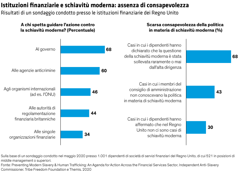 Le società finanziarie non possono permettersi di chiudere un occhio. Il rischio di essere coinvolti in uno scandalo legato a pratiche di schiavitù moderna può macchiare irrimediabilmente la reputazione di un marchio o di un'impresa. Basta chiedere all'istituto di credito australiano Westpac, che nel 2020 ha pagato una multa di 1,3 miliardi di dollari come patteggiamento per l'accusa di aver agevolato il riciclaggio di denaro da parte di 250 clienti che finanziavano lo sfruttamento di minori.