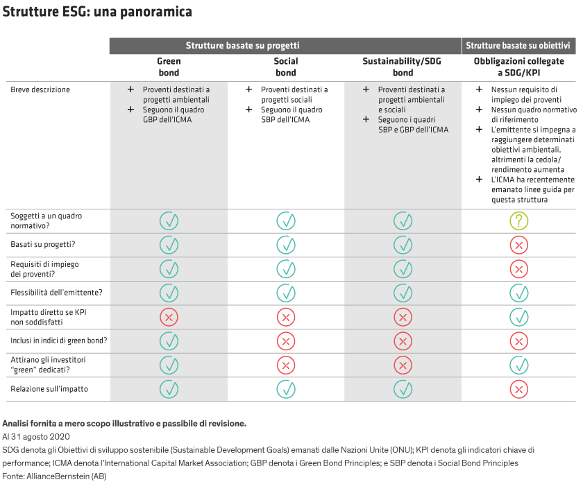 A causa della proliferazione di obbligazioni legate ai temi ESG, gli investitori devono essere consapevoli delle differenze tecniche e comprendere le implicazioni d’investimento per ogni classe di questi titoli.
