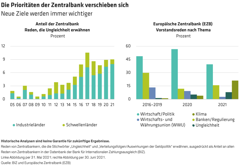 Bis vor Kurzem hatten die Zentralbanken eine einfache Aufgabe: die Gewährleistung der Preisstabilität. Jetzt werden sie in andere Bereiche hineingezogen: Verringerung der Ungleichheit, Unterstützung des grünen Übergangs und vieles mehr. Wenn die Inflationsbekämpfung nur noch ein Ziel unter vielen ist, steigt das Risiko, dass sie zugunsten dringenderer Anliegen aufgegeben wird.